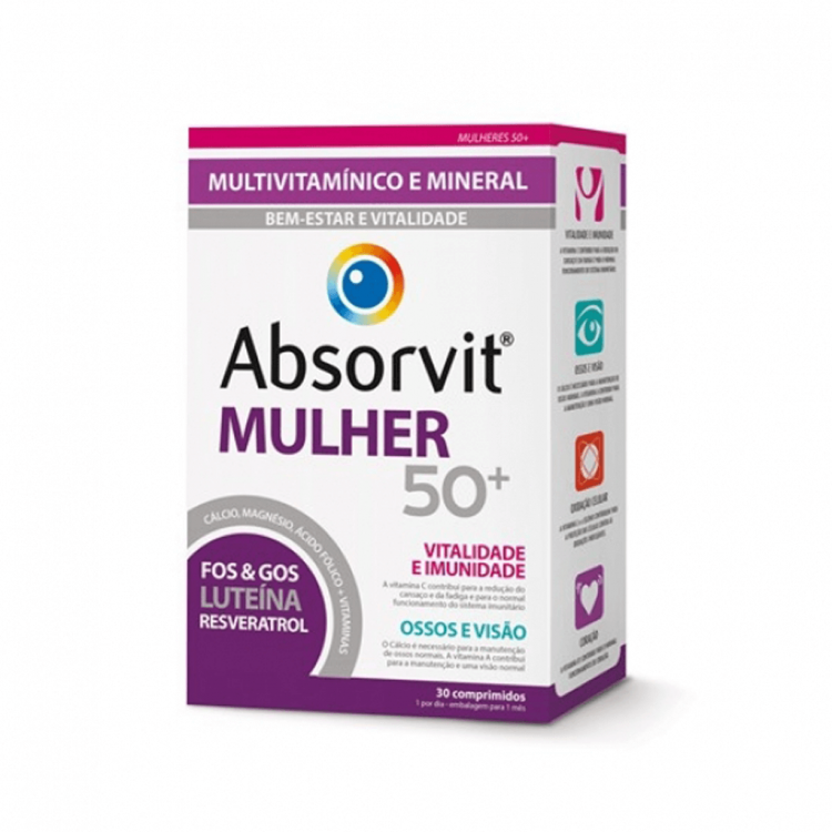 ABSORVIT MULHER 50+ é o suplemento alimentar especialmente desenvolvido para responder a necessidades nutricionais específicas da mulher após os 50 anos de idade.