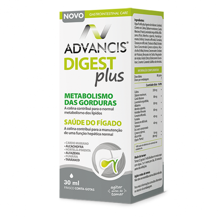 ADVANCIS® DIGEST PLUS é um suplemento alimentar concebido para promover o bom funcionamento hepático e da vesícula biliar. Contém colina, que contribui para a manutenção da saúde do fígado, sendo fundamental para o metabolismo das gorduras. Foi reforçado com extratos de plantas com importante ação na melhoria da digestão/ desintoxicação hepática. ADVANCIS® DIGEST PLUS pode ser utilizado em SOS para facilitar as digestões mais difíceis.