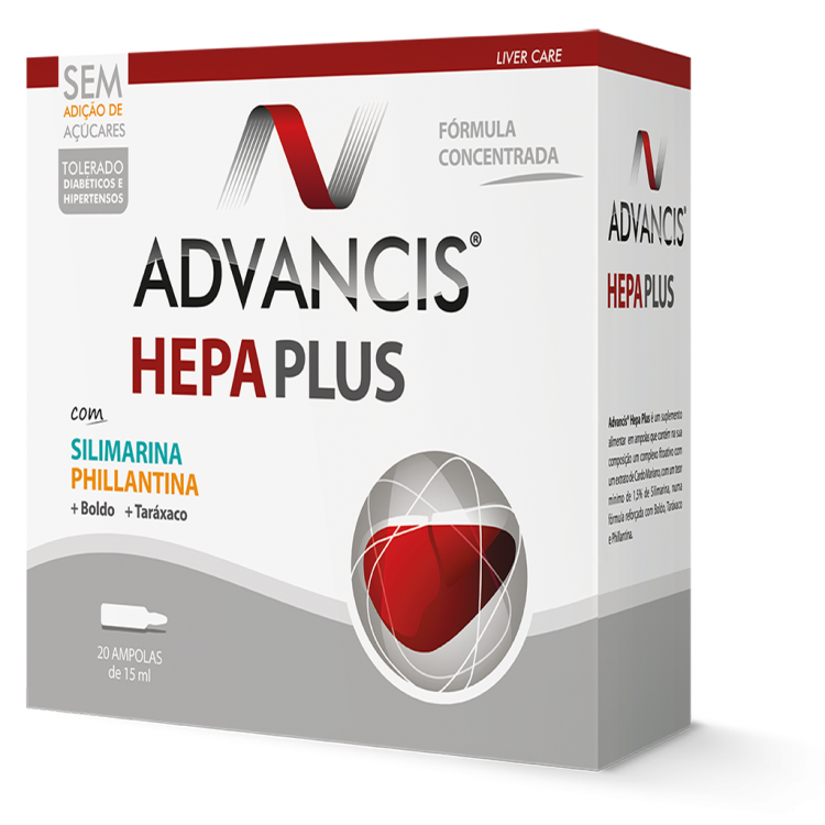 ADVANCIS® HEPA PLUS é um suplemento alimentar em ampolas que contém um complexo fitoativo composto por um extrato de cardo mariano, com um teor mínimo de 1,5% de silimarina, numa fórmula reforçada com boldo, taráxaco e phillantil™.