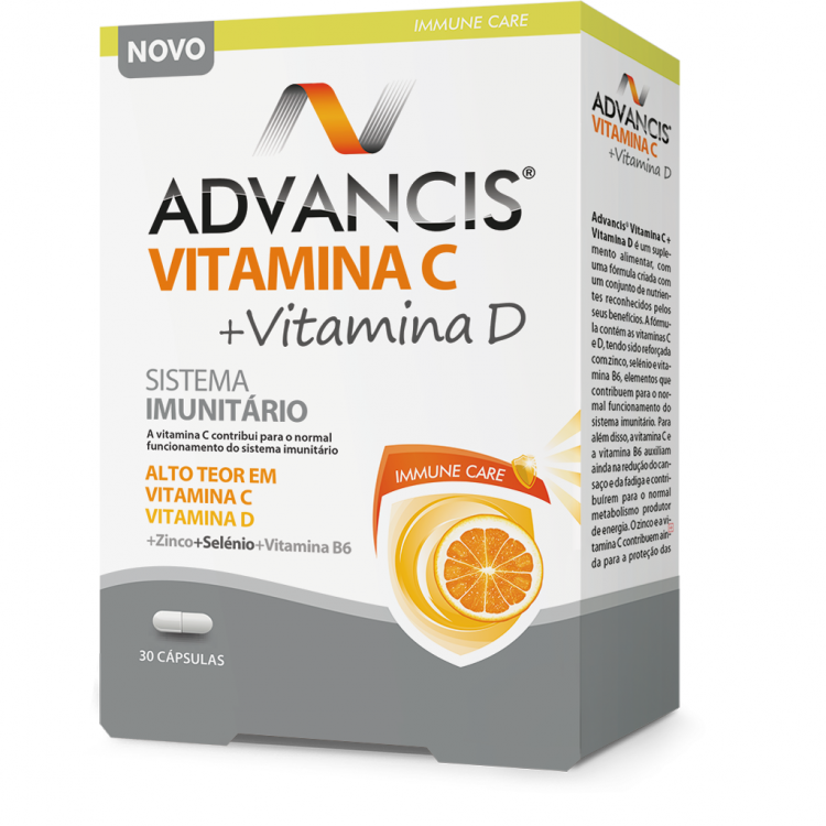 Advancis® Vitamina C + Vitamina D é um suplemento alimentar, com uma fórmula criada com um conjunto de nutrientes reconhecidos pelos seus benefícios. A fórmula contém as vitaminas C e D, tendo sido reforçada com zinco, selénio e vitamina B6, elementos que contribuem para o normal funcionamento do sistema imunitário. Para além disso, a vitamina C e a vitamina B6 auxiliam ainda na redução do cansaço e da fadiga e contribuírem para o normal metabolismo produtor de energia. O zinco e a vitamina C contribuem ainda para a proteção das células contra as oxidações indesejáveis.