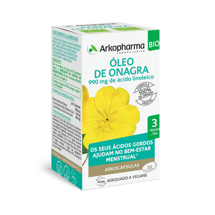 ARKOCÁPSULAS Óleo de Onagra é um suplemento alimentar à base de Óleo de Onagra. O Óleo de Onagra tem um alto conteúdo em ácidos gordos polinsaturados (Ácido Linoleico e Gama Linolénico), que contribuem para o bem-estar durante o ciclo menstrual. A vitamina e contribui para a proteção das células frente ao dano oxidativo.
