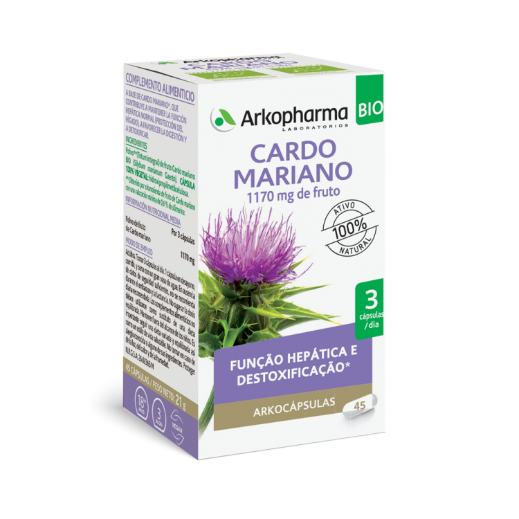 ARKOCÁPSULAS Cardo Mariano é um suplemento alimentar à base de Cardo Mariano. O Cardo Mariano contribui para manter a normal função hepática (proteção do fígado) e, ajuda na digestão e na destoxificação hepática.