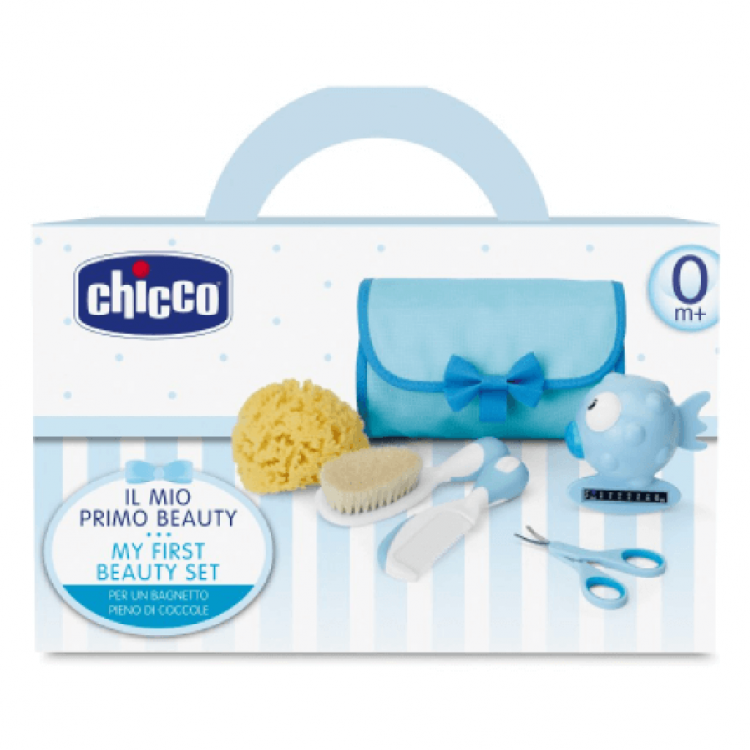 Chicco O meu Primeiro Conjunto de Higiene é o primeiro necessaire do seu bebé. O conjunto inclui inclui: uma escova com cerdas naturais e pente com pontas arredondadas, e com cabo ergonómico, para ser confortável de utilizar; Tesoura em aço inoxidável e com pontas arredondadas e lâminas curtas; Esponja marinha, recolhida no alto mar, e muito macia quando entra em contacto com a água; Termómetro de banho, em forma de peixe-balão, com uma tira termo-sensível ao calor. Para além disso, os produtos vêm dentro de uma bolsinha, com bolsos internos para manter os acessórios de banho do bebé devidamente arrumados e prontos a utilizar. Inclui ainda um saco de rede para secar os objetos do bebé.