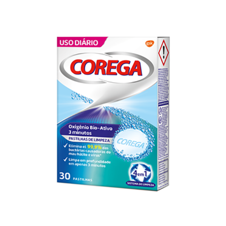 Corega Pastilhas de Limpeza Oxigénio Bio-Ativo proporciona uma limpeza em 3 minutos. Elimina 99,9% das bactérias causadoras do mau hálito*. Para próteses dentárias e aparelhos ortodônticos. *em testes laboratoriais