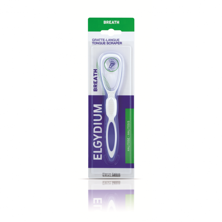O raspador de língua ELGYDIUM Breath assegura uma correta higienização da língua. Ao raspar o dorso da língua e eliminar a película bacteriana depositada, contribui para combater o mau hálito.