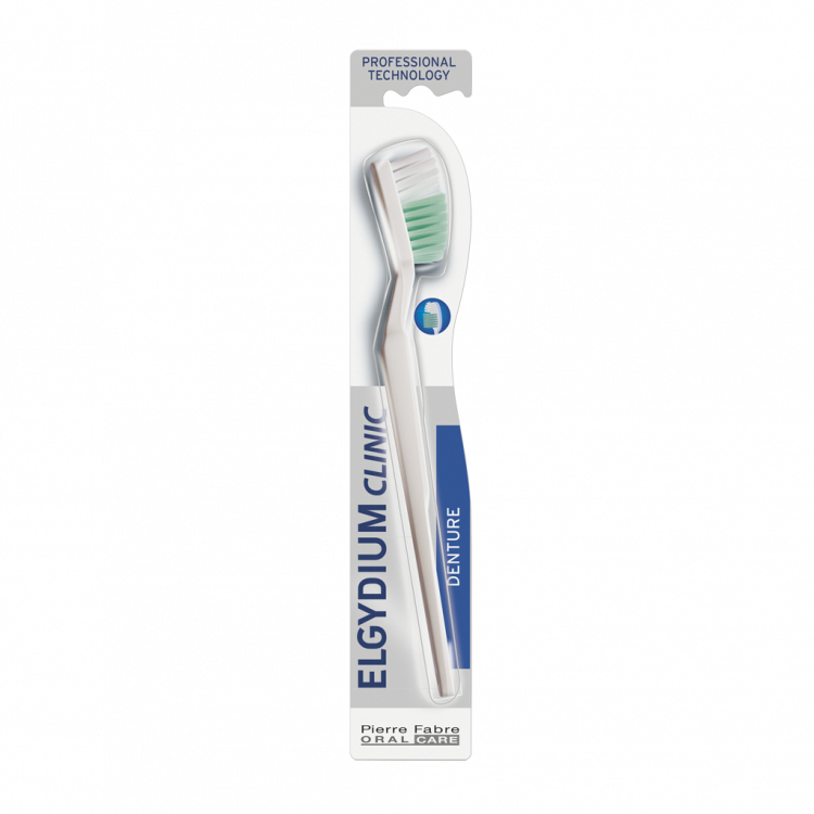 A ELGYDIUM CLINIC PRÓTESE é uma escova de dentes especificamente desenvolvida para a higiene das próteses removíveis.