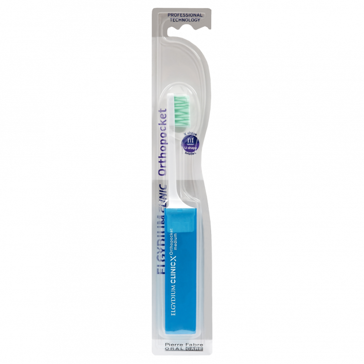 Elgydium Clinic X Escova de Dentes Orthopocket é uma escova de dentes para adultos indicada em ortodontia. Apresenta filamentos de implantação transversal em X e cabo dobrável. Graças ao seu tamanho, é ideal para transportar (férias, trabalho, ginásio).