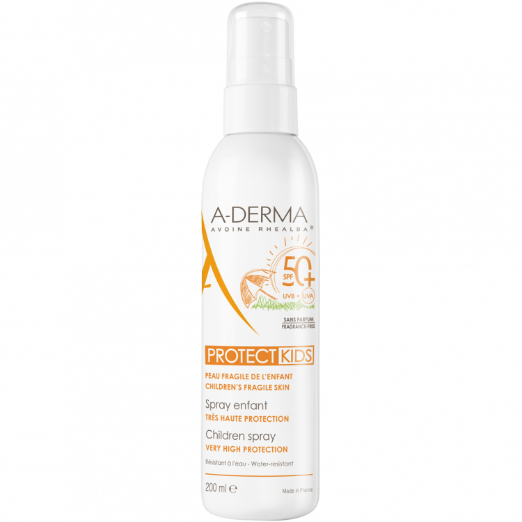Spray criança SPF 50+ Proteção solar da pele frágil da criança ou alérgica a perfume. Reforça a barreira cutânea, defende as células contra os UVA. Rosto e corpo