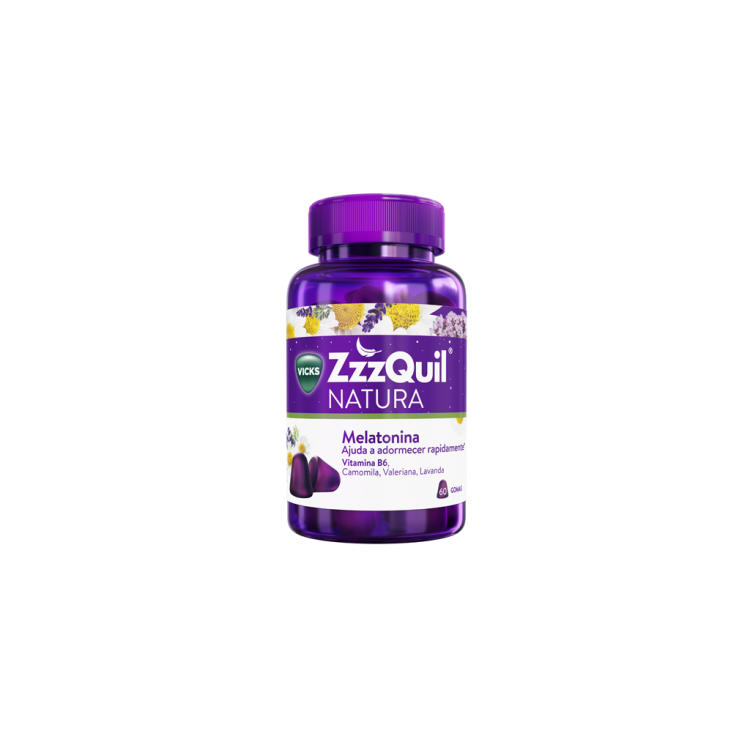 Suplemento alimentar para reconciliação do sono.ZzzQuil Natura Gomas contém na sua formulação melatonina, extractos de ervas (valeriana, camomila e lavanda) e vitamina B6.