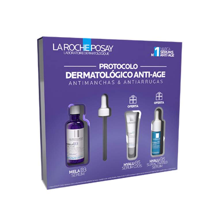 O La Roche-Posay Protocolo Dermatológico Anti-Age Mela B3 é uma rotina completa que uniformiza o tom, hidrata e preenche a pele. Este coffret combina três séruns de alta eficácia — Mela B3 Sérum, Hyalu B5 Olhos e Hyalu B5 Superactivated — para uma pele luminosa, uniforme e visivelmente rejuvenescida.