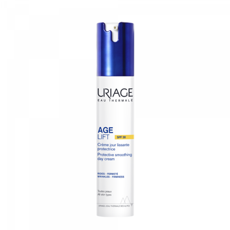 A gama dermatológica com cuidados lifting antienvelhecimento para uma pele mais firme e suave [3x menos rugas, 3x mais firmeza]*. Este creme protetor atua simultaneamente sobre as rugas e firmeza e protege das agressões diárias a que a pele está sujeita: luz azul, raios UV, poluição, stress e fadiga. Previne o envelhecimento prematuro da pele e o aparecimento de manchas castanhas. A pele fica mais firme e suave, com uma aparência mais lisa e os contornos mais definidos. Ingredientes ativos antienvelhecimento de renome: [RETINOL** + ÁCIDO HIALURÓNICO + FILTROS UVA/UVB SPF30] CORREÇÃO DE RUGAS + FIRMEZA A sua fórmula rica em ingredientes ativos antienvelhecimento [Retinol** + Ácido Hialurónico] reduz a aparência das rídulas e rugas e atua na perda de firmeza e tonicidade PROTEÇÃO ANTIENVELHECIMENTO A pele é protegida dos efeitos nocivos da poluição, luz azul e sol através da tecnologia Barreira da Luz Azul*** e dos filtros UV para uma proteção SPF30. HIDRATAÇÃO Fórmula enriquecida com Glicerina para uma pele flexível e hidratada ELEVADA TOLERÂNCIA A Água Termal de Uriage suaviza e acalma todos os tipos de pele, mesmo a mais sensível. Para todos os tipos de pele, mesmo as mais sensíveis. ABORDAGEM ECO-FRIENDLY Embalagem Eco-Responsável: o Instruções em papel removidas das caixas o Caixa de tamanho mais pequeno = 4 toneladas de papel/cartão poupadas por ano** *Estudo clínico realizado sob controlo dermatológico em 24 mulheres. Aplicação 1x por dia de Age Lift Creme de Dia durante 2 meses. Auto-avaliação através de uma escala. **Palmitato de retinol. ***Teste in vitro no ingrediente. ****Gama Age Lift – quantidades 2021.